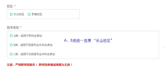 5.鉴于放音设备资源及A、B、C类同时播放听力的考试要求等因素,A、B类考生“校 区”选项栏统一选填“长山校区”(见图1),学校届时将为跨校区参赛的同学统一安排竞赛专车接送。